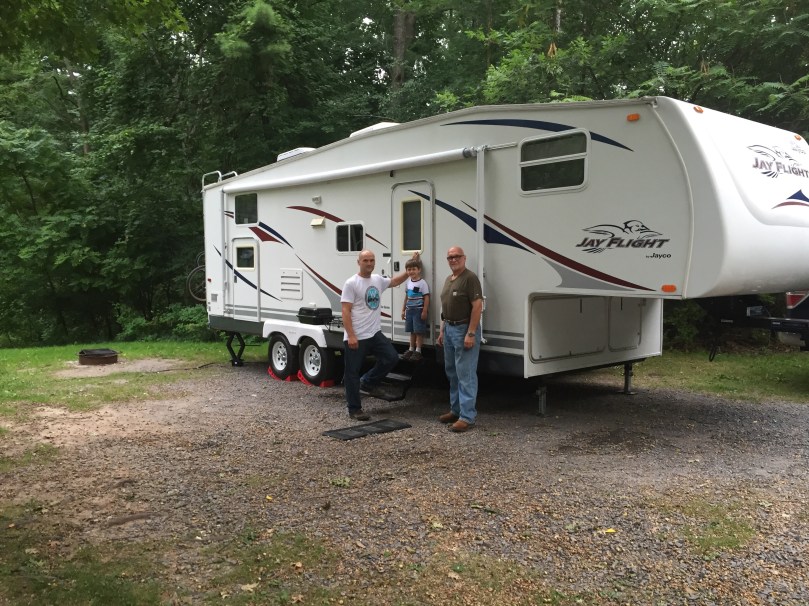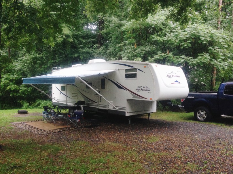 I feel like a like a little background information is needed to understand this first camping trip… Our family (Chris’s parents…) has a hay farm and enjoy going to farm shows. Chris and his dad wanted to go to the Empire Farm Days show and they decided it would be a good opportunity to use the camper while both of them were there to learn the ins