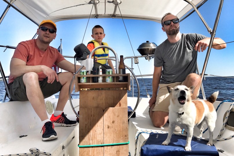 Saturday morning, Mike took us sailing and the boys took turns steering the wheel. When we got back to the marina, Judy and Wynn were there and we took a family picture before we went back to the campground and they headed out to sea.