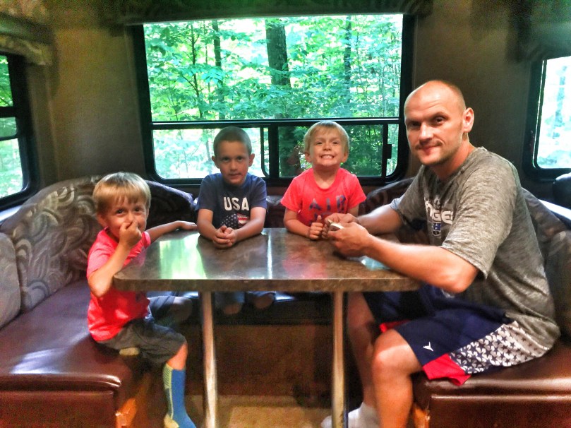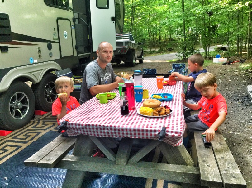 When we got back to the campsite, we started making dinner and the boys played in their room (so nice! I love that they have their own space!) and then they played some cards at the table with Chris while I cleaned up.