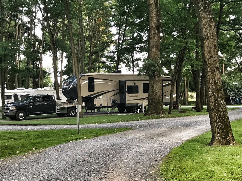 In late August, we packed up the camper and headed north to Niagara Falls. We left on Friday evening and stayed at Arrowhead Marina and RV Park in Schenectady, New York. It broke up the trip — which is helpful with kids — and let us get to our final destination a little earlier the next day. We got there around 6 P.M., set up, ate dinner, and checked out the campground a little bit. Our site was not ideal but it was fine for our short stay. Our fire pit was on the opposite side of where it should be. You can see how close the RVs are to each other in the background of some of the pictures. Our neighbor’s electric hookup is right next to our picnic table.