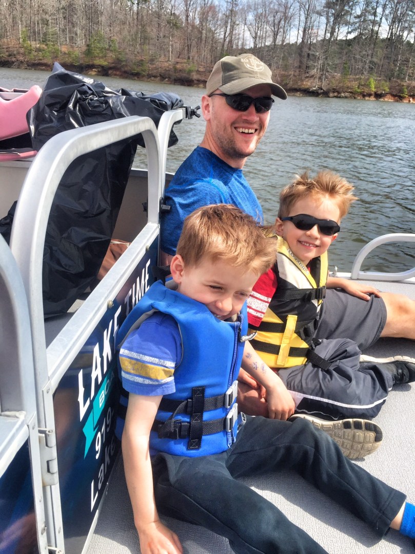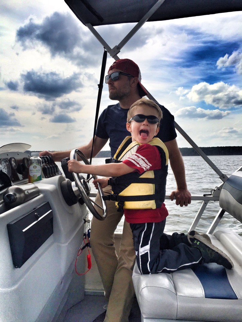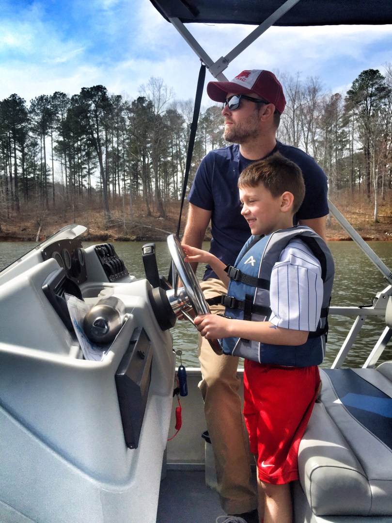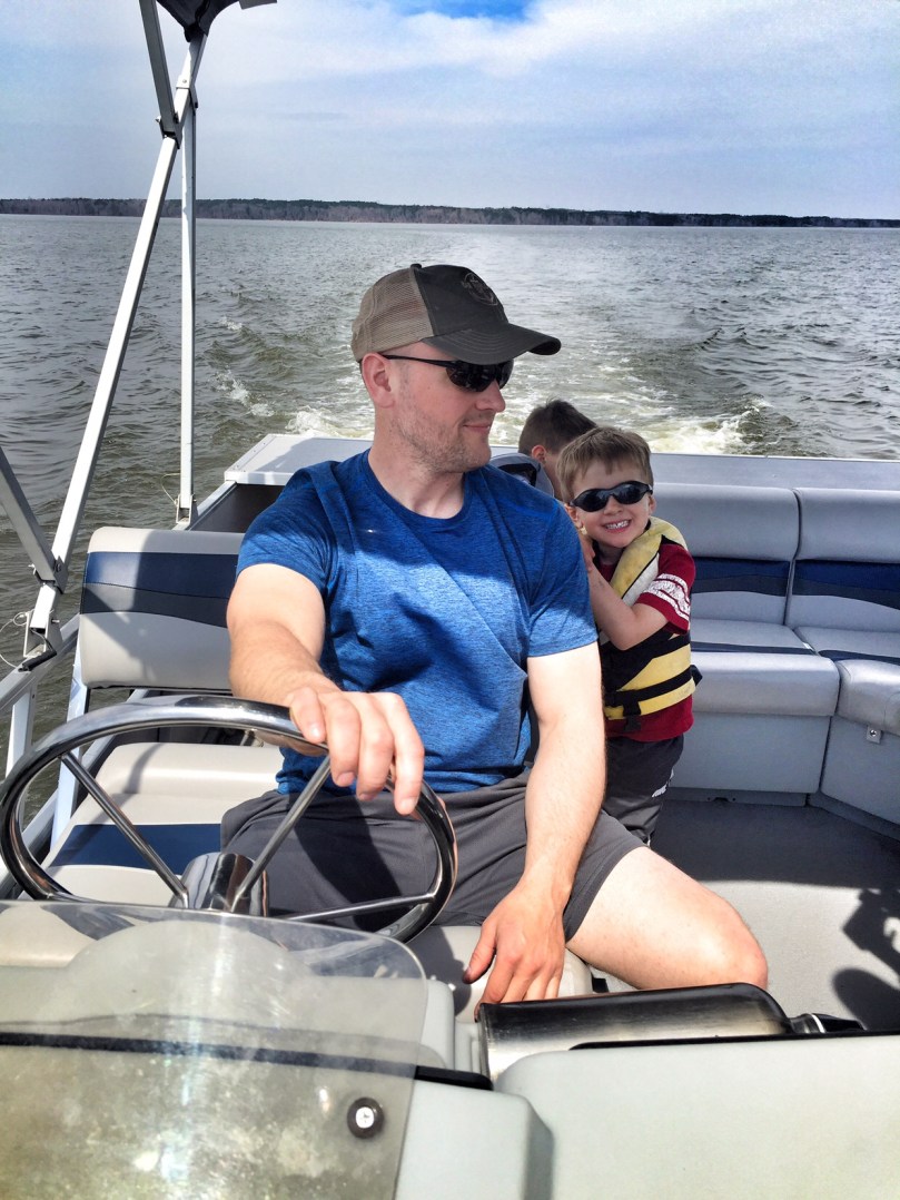 Since we weren’t going to be sailing on this trip, we thought it would be fun to rent a pontoon boat. Chris found two companies who did it in the area and we ended up renting from Lake Time Boat Rental. They weren’t open for the season yet, but they went ahead and got a boat ready for us anyway. They delivered the pontoon to the boat launch in the campground which was super convenient. We loaded ourselves and our stuff on the pontoon and we were on our way! The boys all got a turn to drive with Uncle Mike, which they loved.