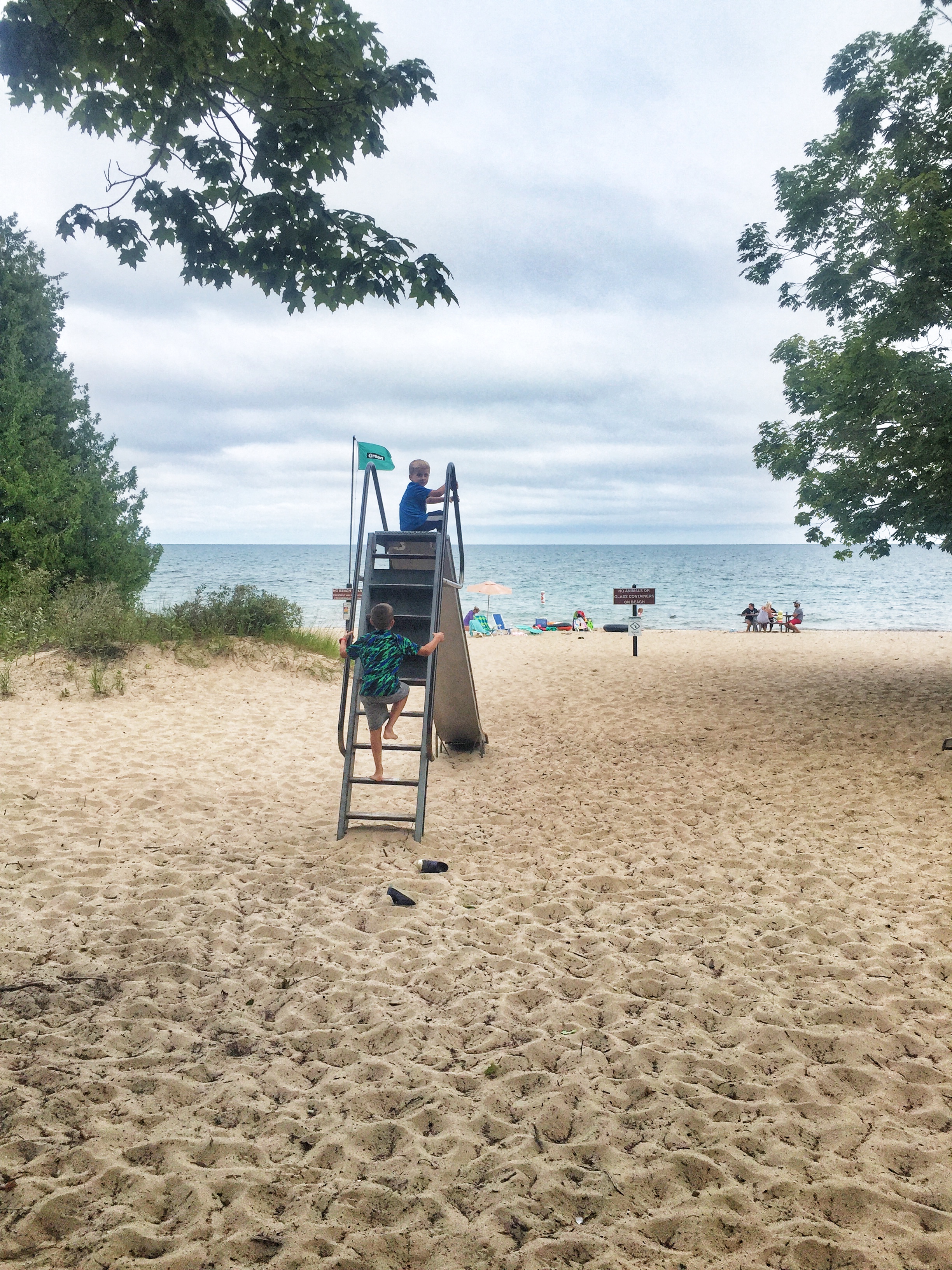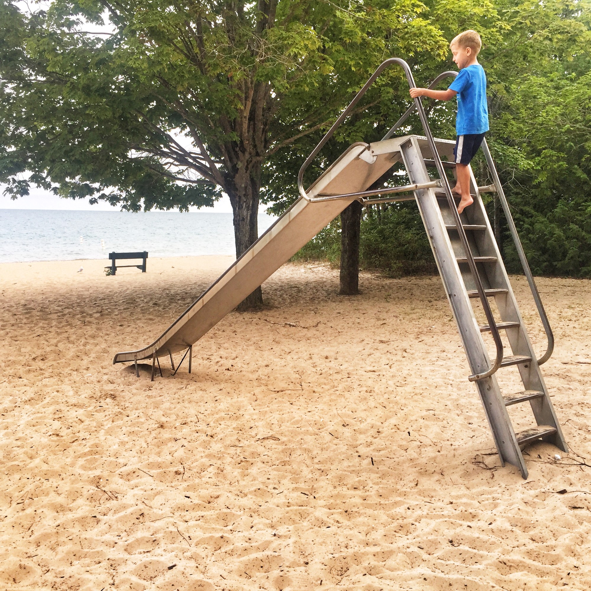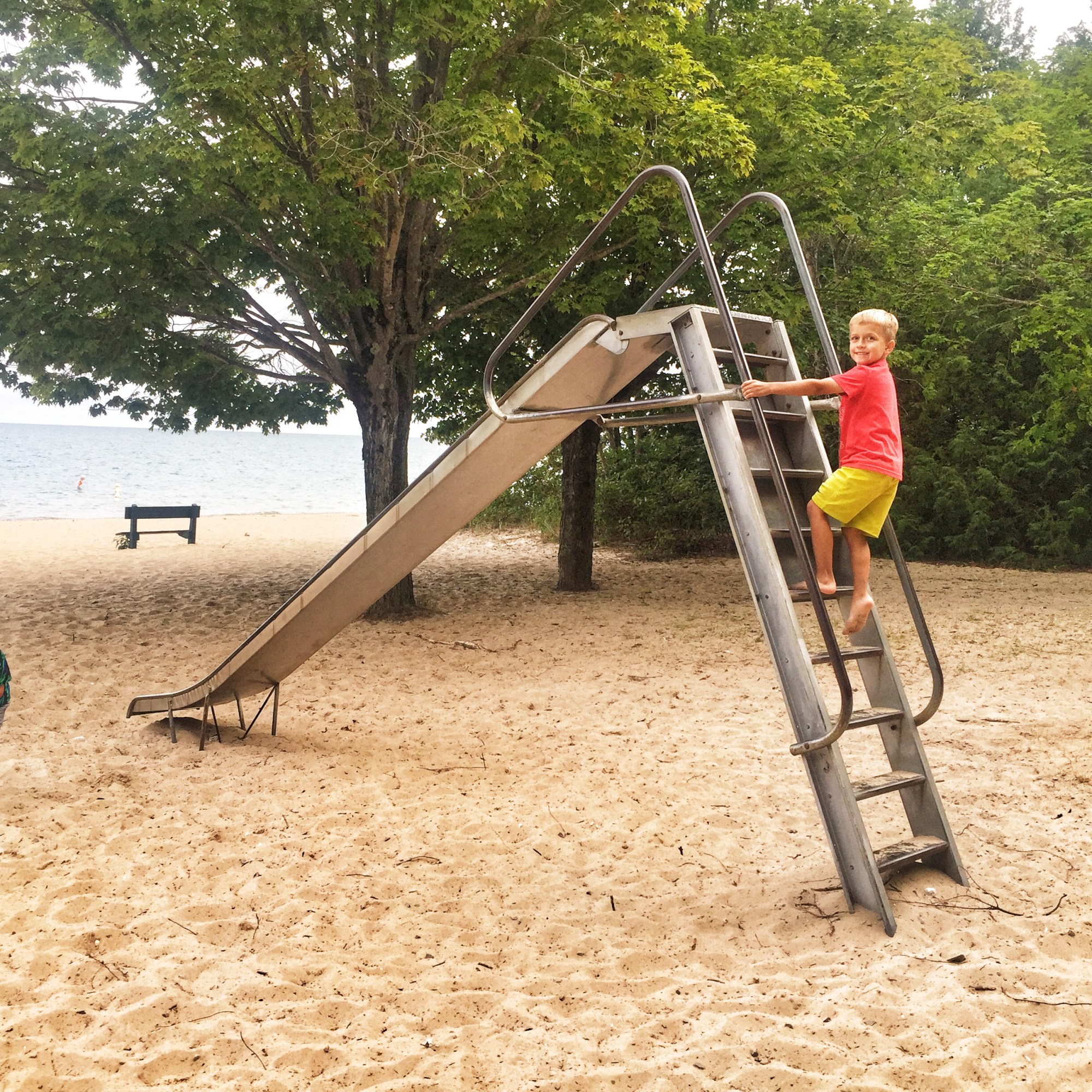 We didn’t bring any sand toys with us, but that didn’t stop the boys from digging in the sand. After they played for a bit, we walked over to check out the second beach. The path to get to this beach was across from our campsite which was super convenient. This beach was a bit quieter and had a slide!