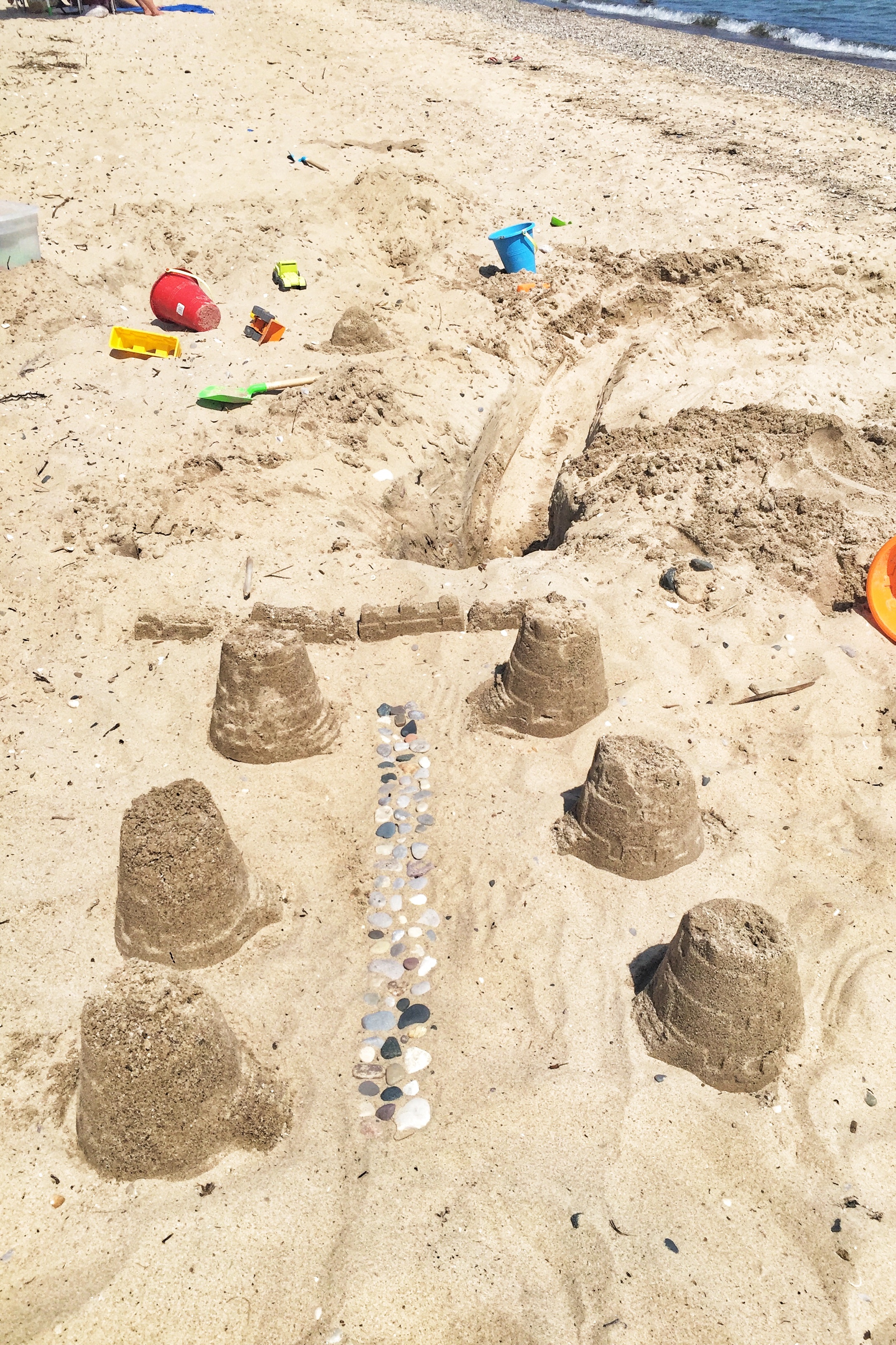 After errands, we went back to the camper for lunch and get ready to go to the beach. We decided to go to the beach with the slide for our Lake Huron beach day. We packed up all our gear in the wagon — towels, tent, blanket, chairs, sand toys — and walked to the beach!