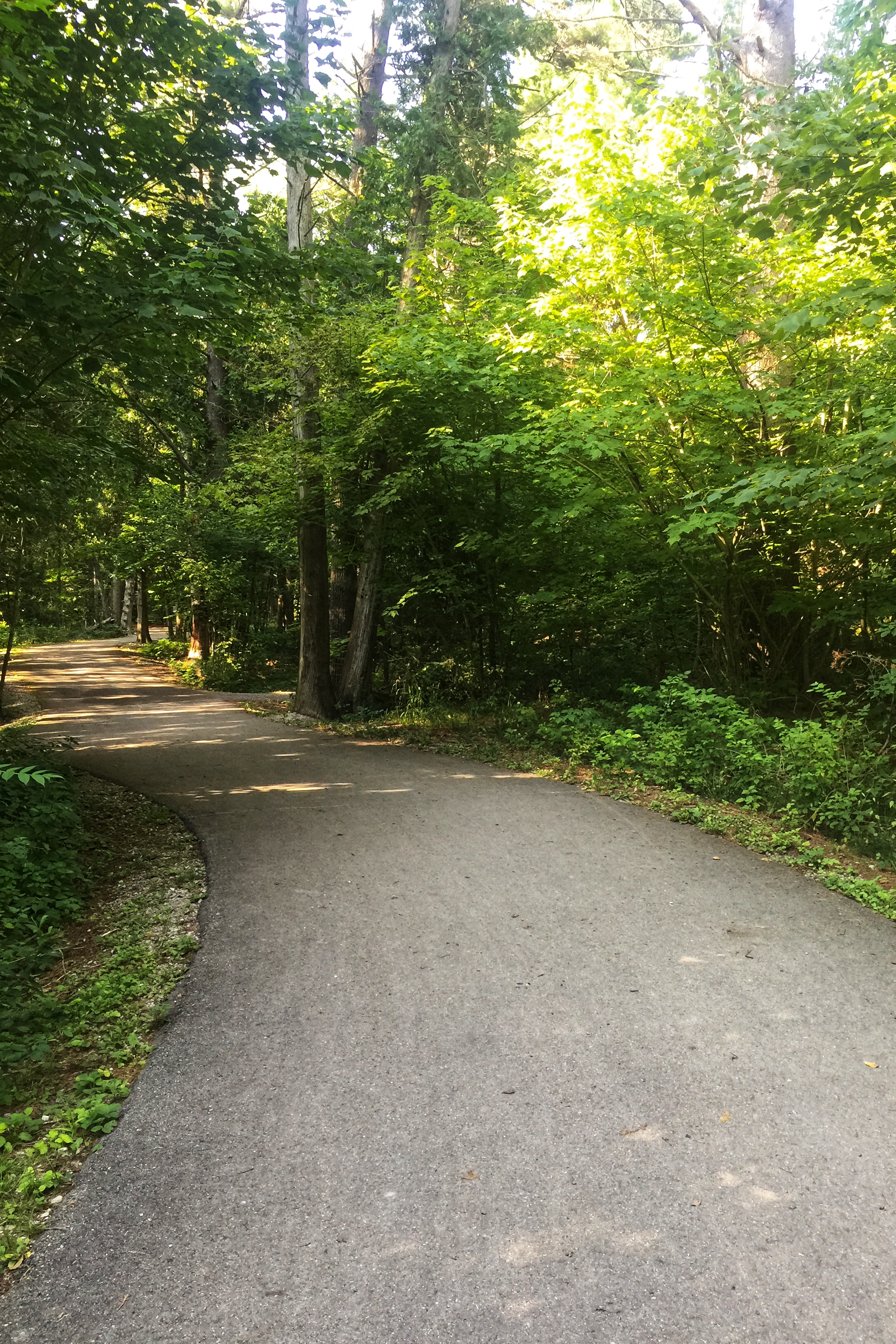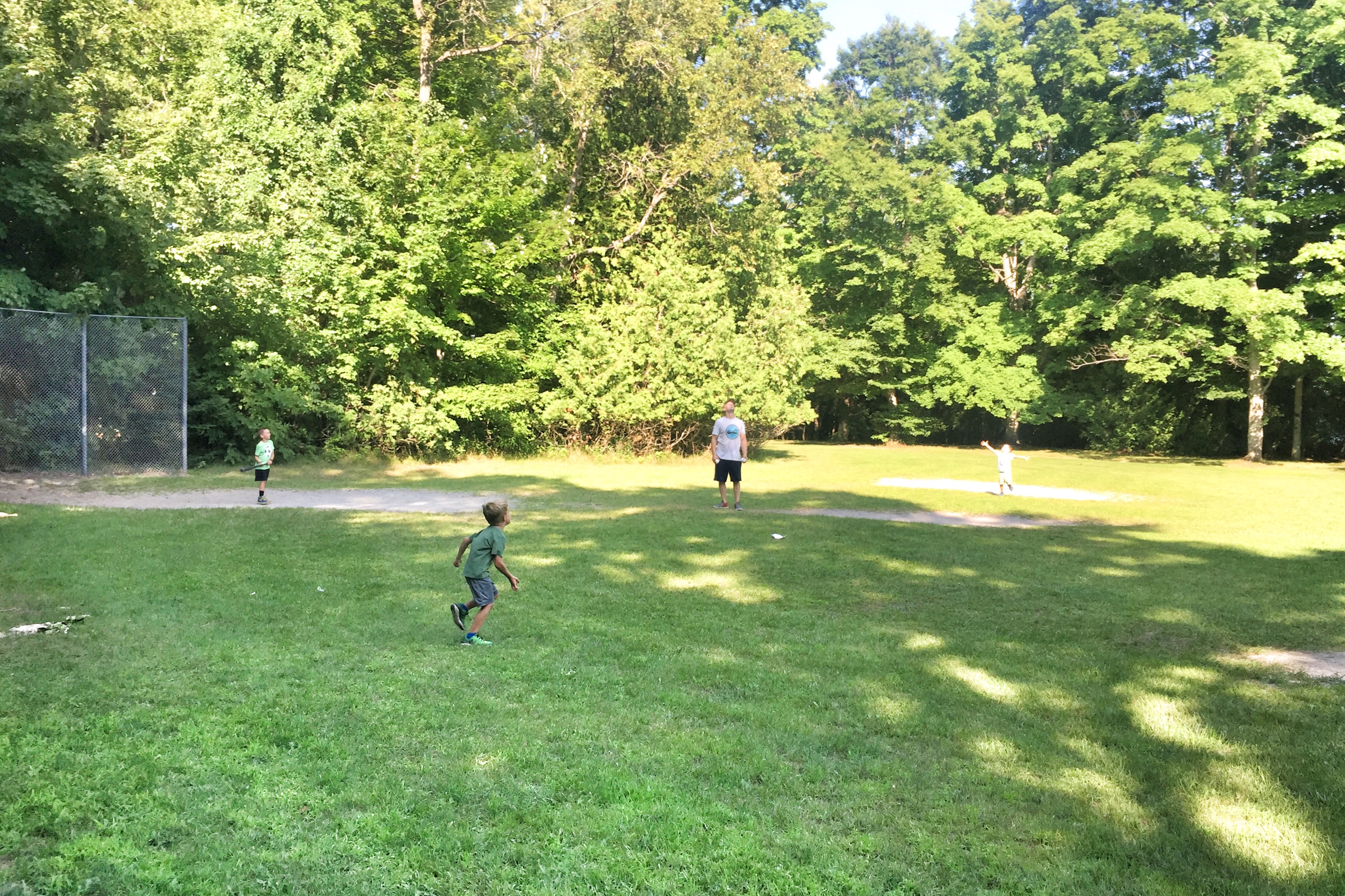 After a few hours of fun, we packed it all up and headed back to the campground. We changed out of our bathing suits and went for a run and bike ride — Chris and I ran while the boys rode their bikes — on the Heritage Route Multi Use Trail, which connects the campground to the town of Harrisville. Afterwards, we headed to the ballfield area to play some wiffle ball.