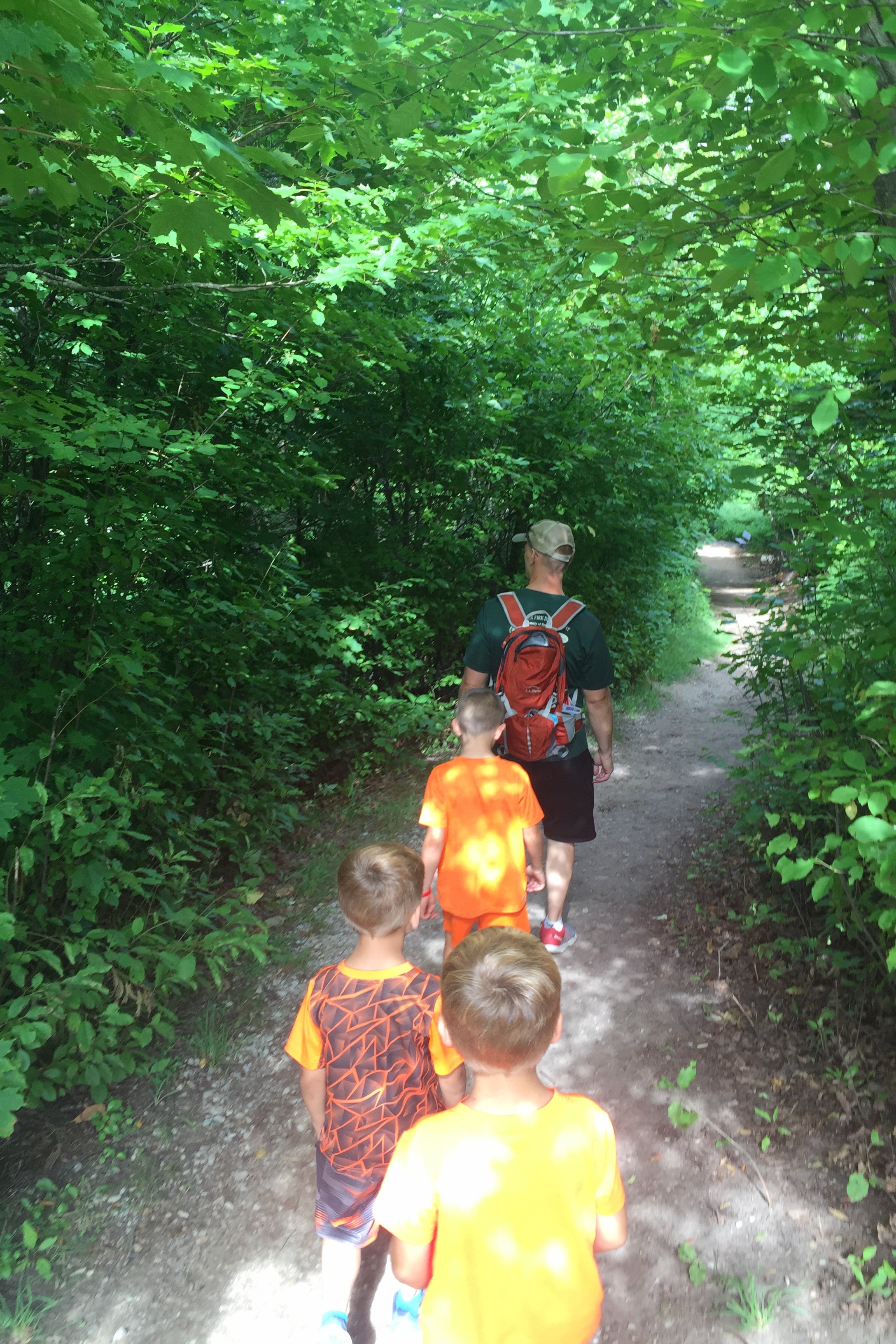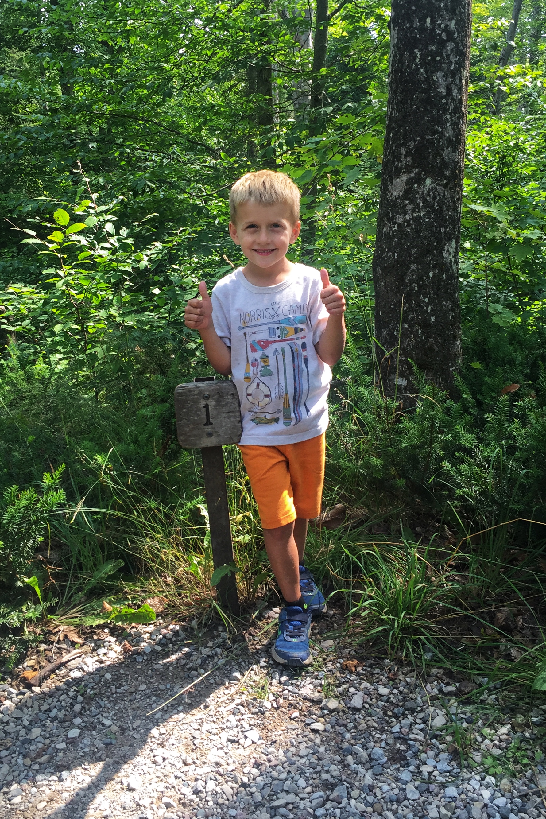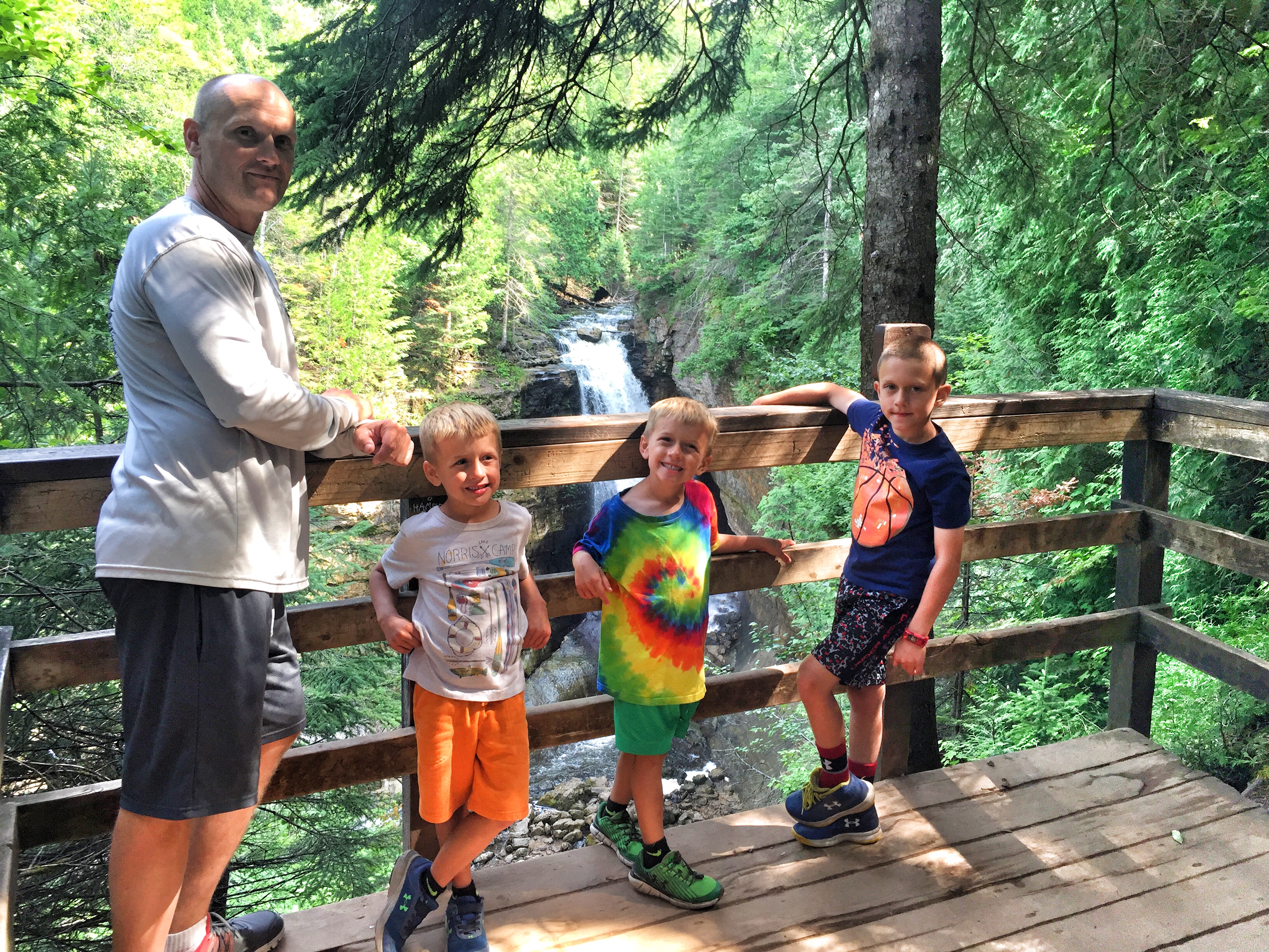 The trail to Munising Falls was footsteps away from the Visitor Center. It was a short walk (800 feet) with two sets of stairs that lead to platforms to view the 50-foot waterfall. The boys were tired by this point, but we forced them to go check out the waterfall. You can see how thrilled Jackson was in the photo below…