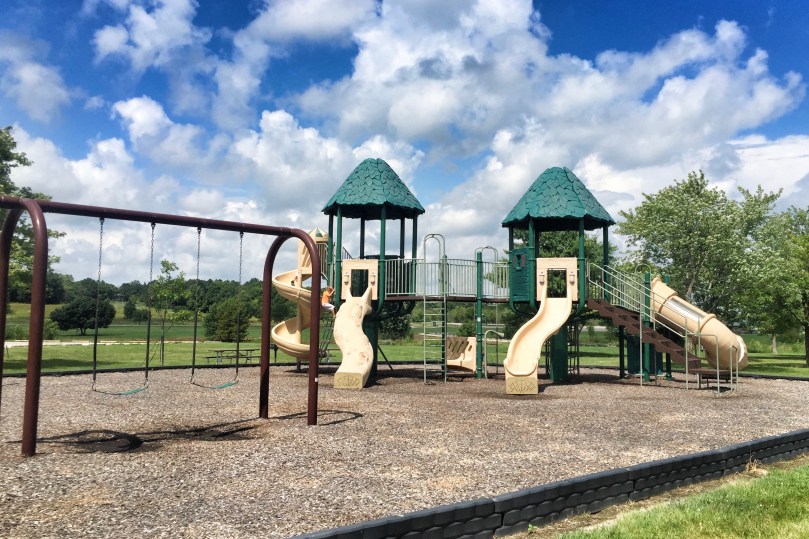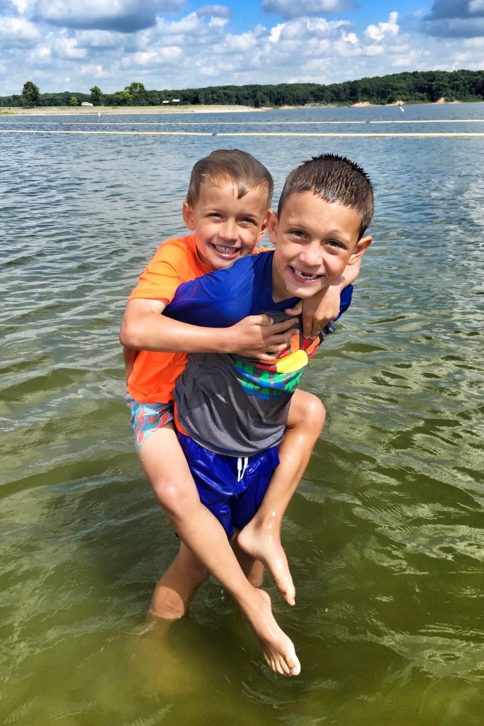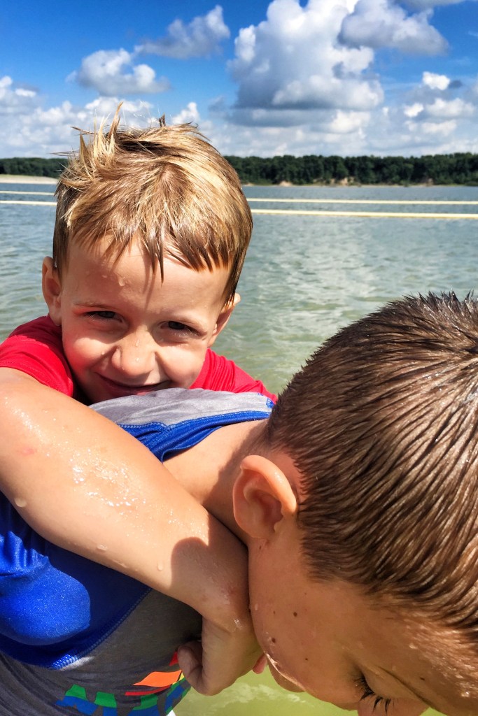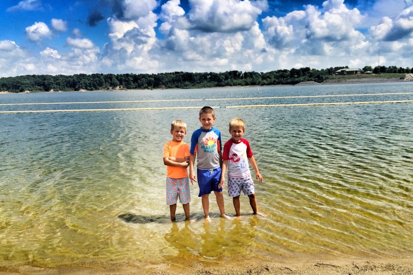 After that, we hopped back in the truck, had the boys change into their bathing suits, and headed to Lake Shelbyville Beach. Lake Shelbyville is a reservoir that was created by damming the Kaskaskia River in Shelbyville, Illinois. Can you believe that in all the years Chris visited Illinois when he was young, he never swam in Lake Shelbyville? Well, our boys did on their first visit and they loved it! They also had a really great playground!